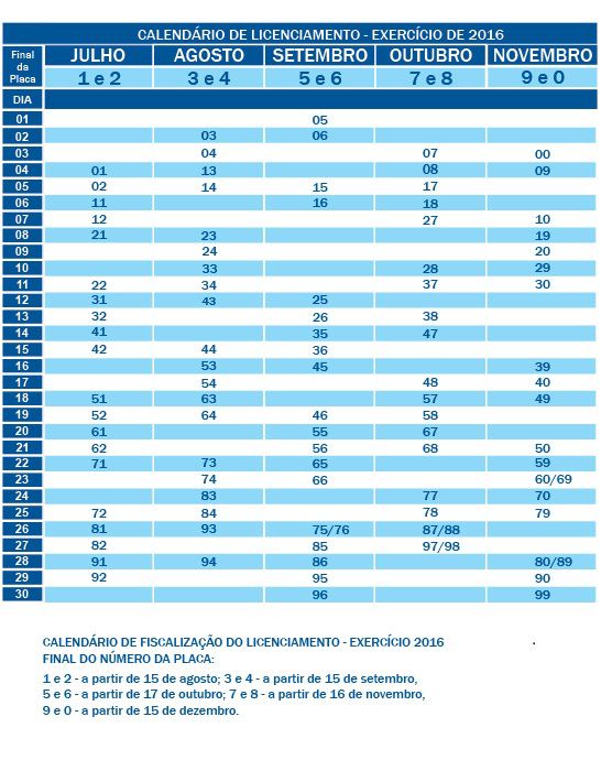 Para encontrar o dia do pagamento é preciso fazer uma leitura nos sentidos vertical e horizontal da tabela. Basta localizar os dois números finais da placa do veículo e ver o dia e mês correspondente.