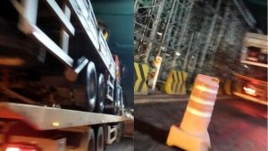 Um caminhão que transportava um veículo de grande porte ficou preso no novo Viaduto de...