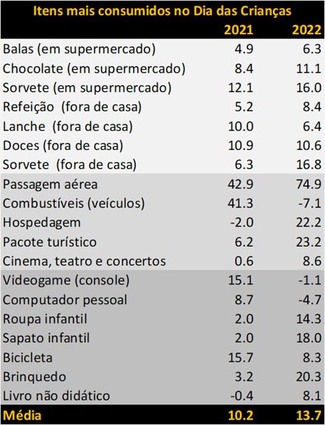 Confira abaixo a tabela com a cesta de itens mais consumidos no Dia das Crianças