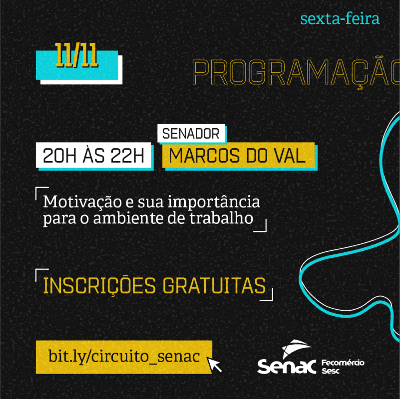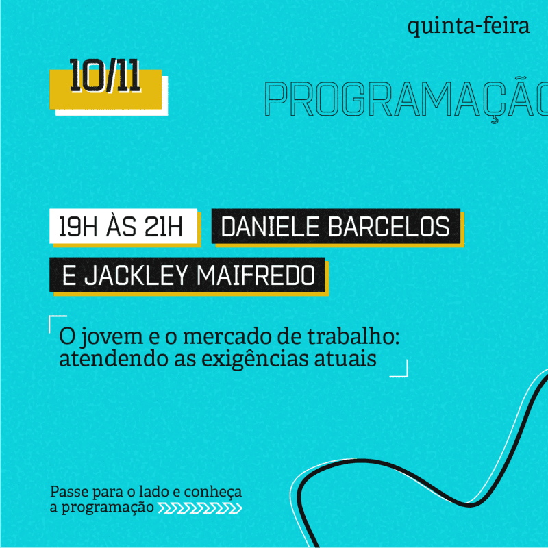 Já para a conferência da sexta (10), das 20h as 22h, o tema da vez é a “Motivação e sua Importância para o Ambiente de Trabalho”, no qual o foco será no crescimento pessoal e profissional como impulso para motivação e na importância de ir além dos papéis e responsabilidades. Para participar da palestra é necessário ter no mínimo 16 anos e Ensino Fundamental II incompleto. ( Clique aqui para realizar a inscrição).