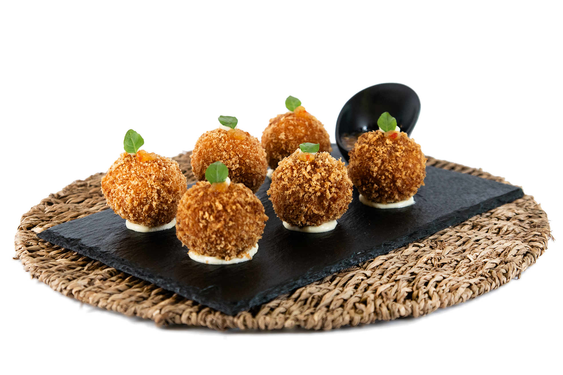 DESCRIÇÃO: Bolinhos de costela suína defumada recheado com molho quatro queijos e bolinhos de linguiça suína caseira com jiló recheado com queijo mussarela. Acompanha geleia de abacaxi da casa.
