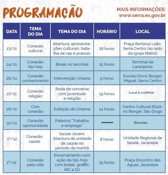 O chefe de articulação de Juventude da Secretaria de Direitos Humanos e Cidadania (Sedir), organizadora do evento, falou sobre a importância do debate sobre políticas para a juventude na Serra. “A cultura é essencial na vida e na formação de cada jovem, por isso durante a semana estamos buscando ações que levam a cultura juntamente com a informação sobre o primeiro emprego e saúde da nossa juventude”.