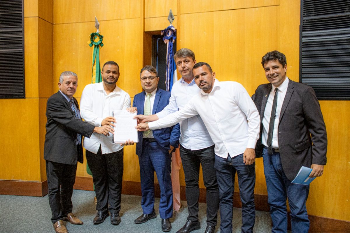 O presidente da CDC, o deputado Vandinho Leite, recebeu os documentos das mãos dos vereadores Anderson Muniz, presidente da CEI, Marlon Fred, Relator e do presidente da Câmara da Serra, Rodrigo Caldeira.