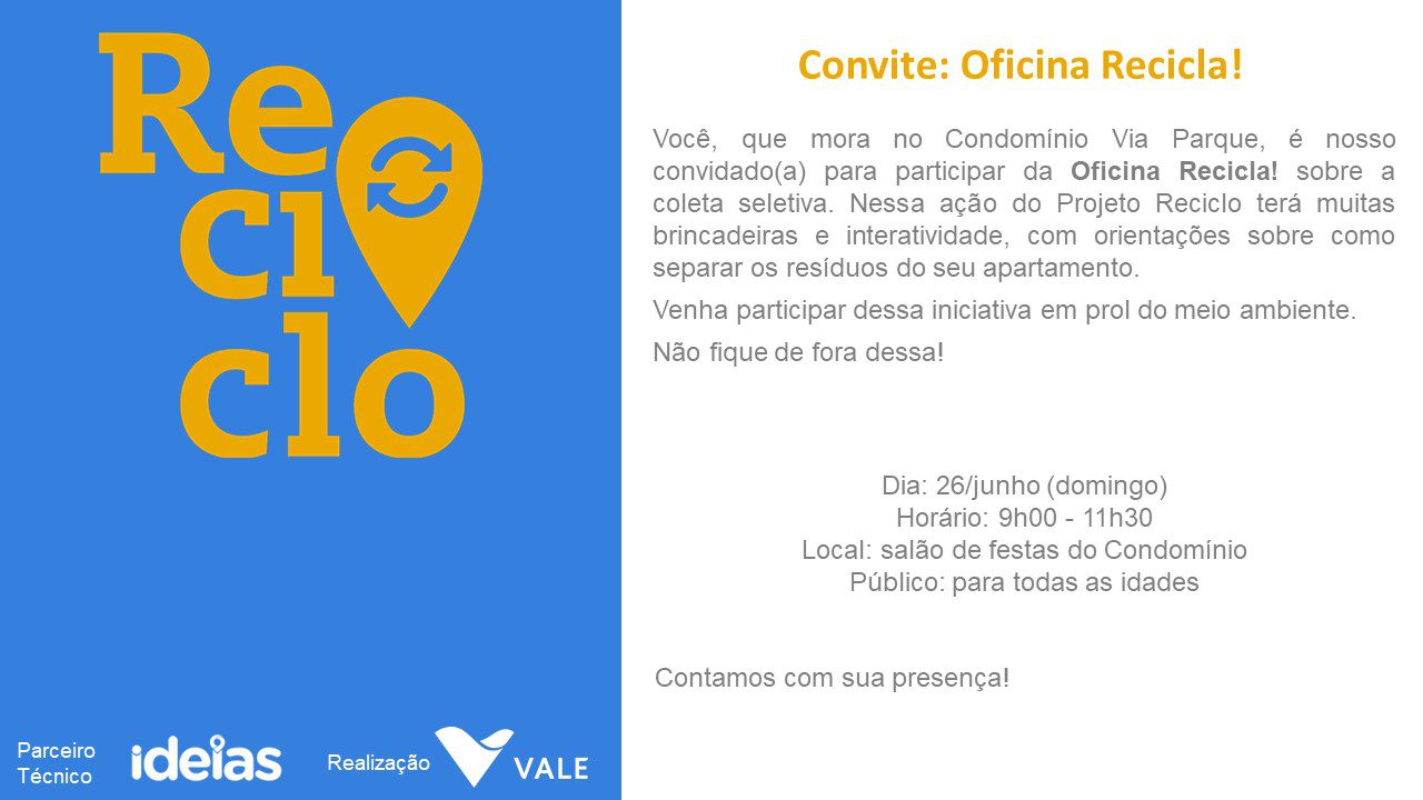 Neste domingo (26), o Condomínio Via Parque, do bairro Morada de Laranjeiras, vai receber o Projeto Reciclo, uma ação conscientizadora sobre a importância da reciclagem. O evento, que vai promover uma oficina sobre a e coleta de lixo no condomínio, acontece com organização do Grupo Ideias em parceria com a Vale e com o Grupo Abrasol, das 9h as 11h30 no salão de festas do local.