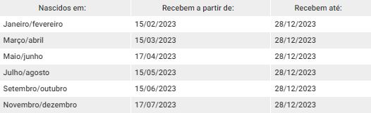 O pagamento dos novos trabalhadores que foram incluídos no lote extra será feito no período entre os meses de abril e julho. Quem teria direito de receber o benefício em fevereiro e março, ou seja, os nascidos entre os meses de janeiro a abril, terá o pagamento liberado a partir do dia 17 de abril.