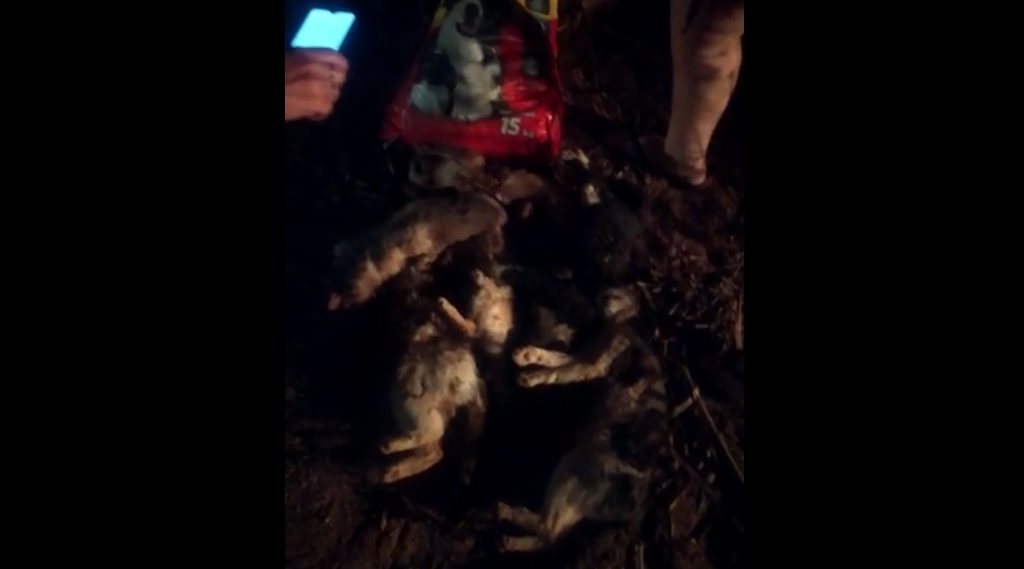 De acordo com informações de moradores que ficaram indignados e fizeram filmagens dos animais mortos, os corpos dos felinos estavam dentro de três sacos de ração.