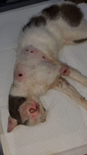 O animal estava vivo e agonizando quando uma mulher, que reside próximo a residência do agressor, com o auxílio de outra pessoa, socorreram o animal.