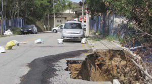 Parte da pista da rua dos Ipês e do alambrado de uma área da Cesan em Santa Luzia, próximo ao Parque da Cidade, desabaram na superchuva do último dia 30 de outubro. Moradores do condomínio vizinho, o Bosque dos Ipês, reclamam que desde então nenhum reparo foi feito.