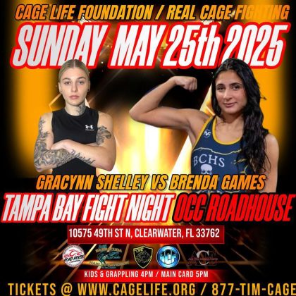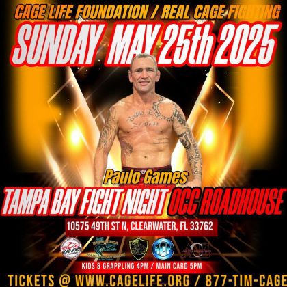 O evento Tampa Bay Fight Night, promovido pela Cage Life Foundation / Real Cage Fighting, reúne atletas amadores e semiprofissionais e será realizado no OCC Roadhouse — um complexo temático com bar, restaurante, espaço para shows e cage de lutas.