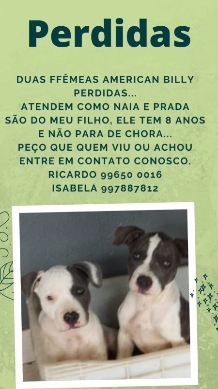 As fêmeas são filhotes, da American Bully, e atendem pelo nome de Nina e Prada. A dona das cadelas, Isabela disse que seu filho de oito anos que é apaixonada pelas pets está sofrendo e chorando diariamente com a perda dos animais.