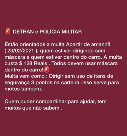 Nós últimos dias, principalmente na terça (23) uma notícia tem sido veiculada em grupos de WhatsApp dando conta de que o Departamento Estadual de Trânsito do Espírito Santo (Detran|ES) juntamente com a Polícia Militar iriam multar motoristas que porventura fossem flagrados dentro de seus veículos sem máscaras.