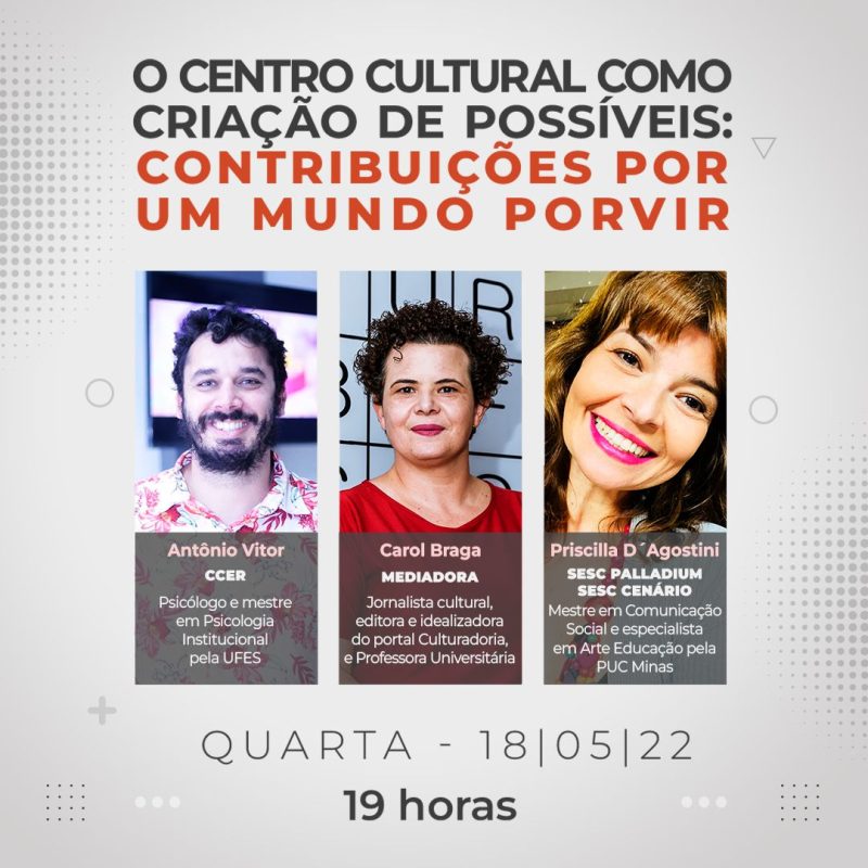 O evento contará com a participação da mestre em Comunicação Social do Sesc Palladium e Sesc Cenário, e especialista em Arte Educação pela PUC Minas Gerais, Priscilla D’Agostini.
