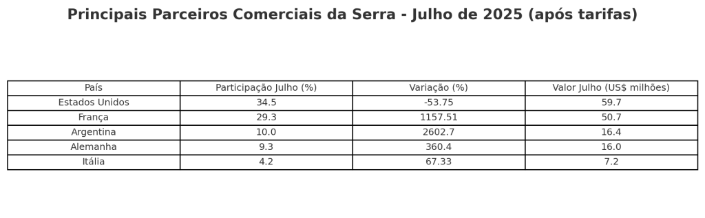 Fecham o grupo dos cinco principais parceiros comerciais em julho a Alemanha, com 9,3% (US$ 16 milhões), e a Itália, com 4,2% (US$ 7,2 milhões), reforçando a crescente importância do mercado europeu para os produtos da Serra.