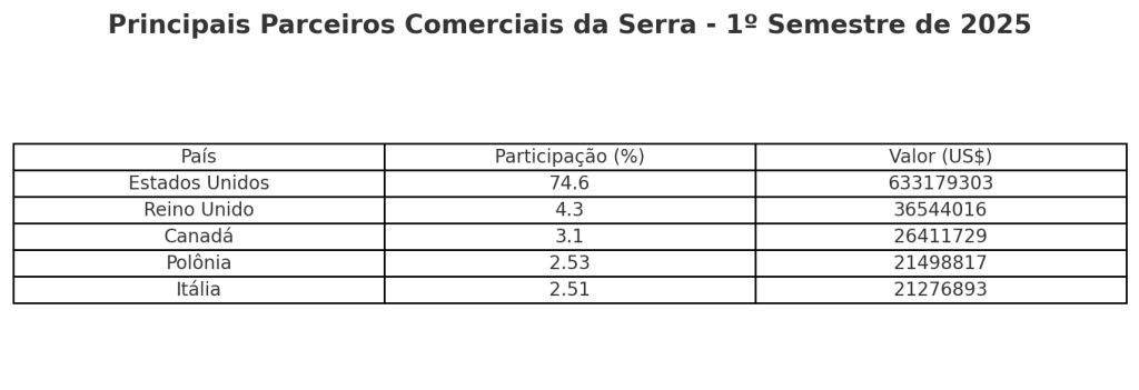 Nos seis primeiros meses de 2025, a lista dos cinco principais parceiros comerciais da Serra foi composta por: Estados Unidos (74,6%), Reino Unido (4,3%), Canadá (3,1%), Polônia (2,53%) e Itália (2,51%).