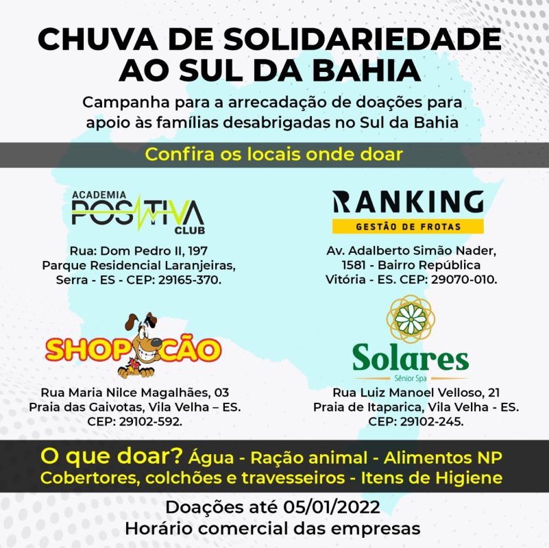 Pensando em ajudar os baianos, um grupo de empresas capixabas está fazendo uma campanha para arrecadar donativos que serão enviados para as pessoas necessitadas.