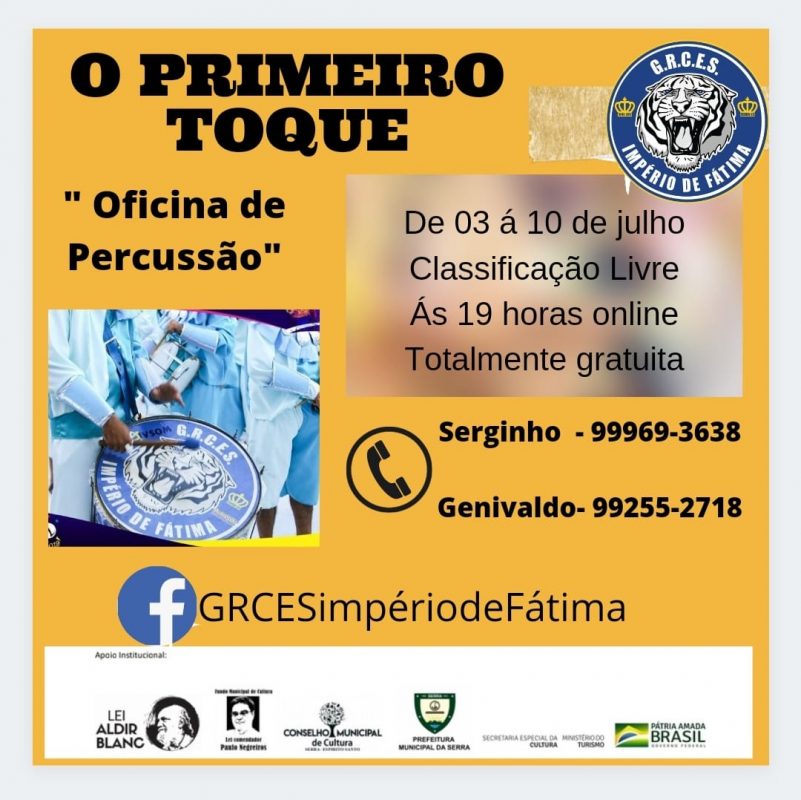 A escola de samba Império de Fátima, de Bairro de Fátima, vai promover oficina de percussão virtual gratuita por meio de projeto Primeiro Toque.