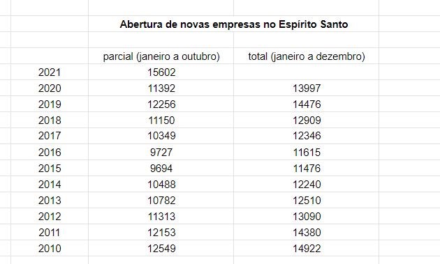 Com os 1.392 empreendimentos abertos em outubro, o Espírito Santo chegou a 15.602 aberturas de empresas no ano. Com essa marca, 2021 supera 2010, que havia registrado a criação de 14.922 novas empresas. A título de comparação, em todo o ano de 2020, a abertura de empresas não chegou a 14 mil.