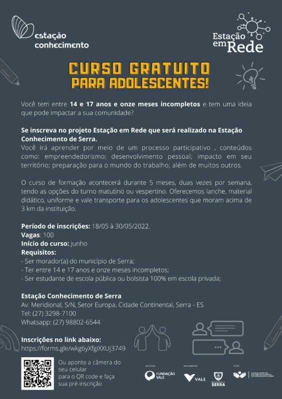 Estão abertas até o dia 30 de maio as inscrições para o curso de Educação Empreendedora e Inovação Social do Projeto Estação em Rede, desenvolvido pela Estação Conhecimento Serra. Ao todo, são oferecidas 100 vagas gratuitas para adolescentes que pretendem ampliar seus conhecimentos sobre empreendedorismo, desenvolvimento pessoal, impacto em seu território e preparação para o mundo do trabalho, entre outras áreas.