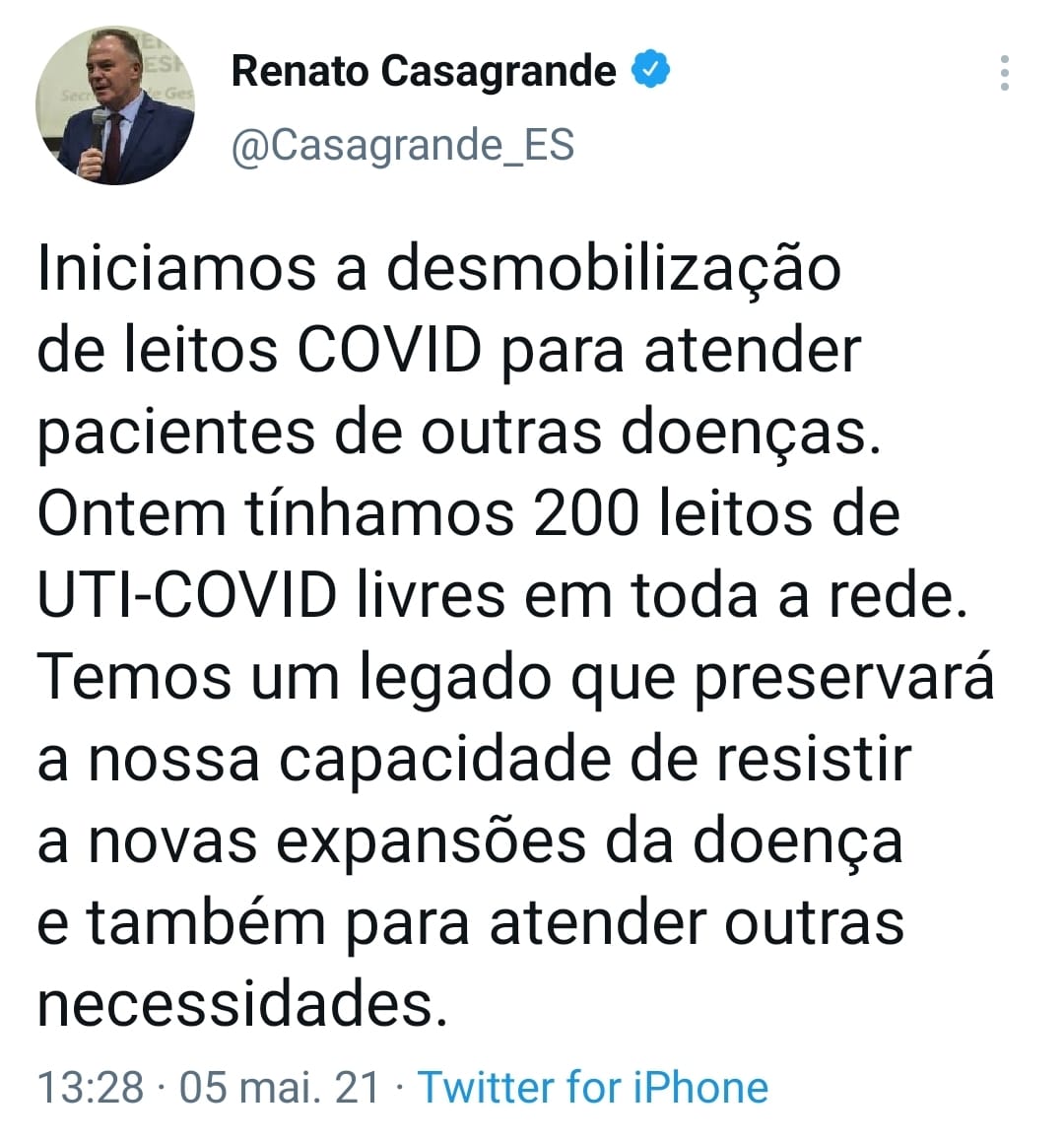 “Ontem tínhamos 200 leitos de UTI-Covid livre em toda a rede. Temos um legado que preservará a nossa capacidade de resistir a novas expansões da doença e também para atender outras necessidades”, disse Casagrande via suas redes sociais.