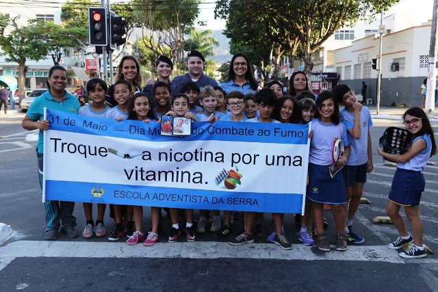 A ação “Troque a Nicotina por uma Vitamina” foi alusiva ao Dia Mundial sem Tabaco, que mobilizou várias instituições. Entre os assuntos abordados pelas crianças, estiveram as drogas, o fumante passivo e alimentação saudável. Além das informações, os fumantes receberam um convite para participar de um curso especial intitulado “Como Deixar de Fumar em Cinco Dias”, promovido pela Igreja Adventista do Sétimo Dia de Serra Sede em parceria com a escola.