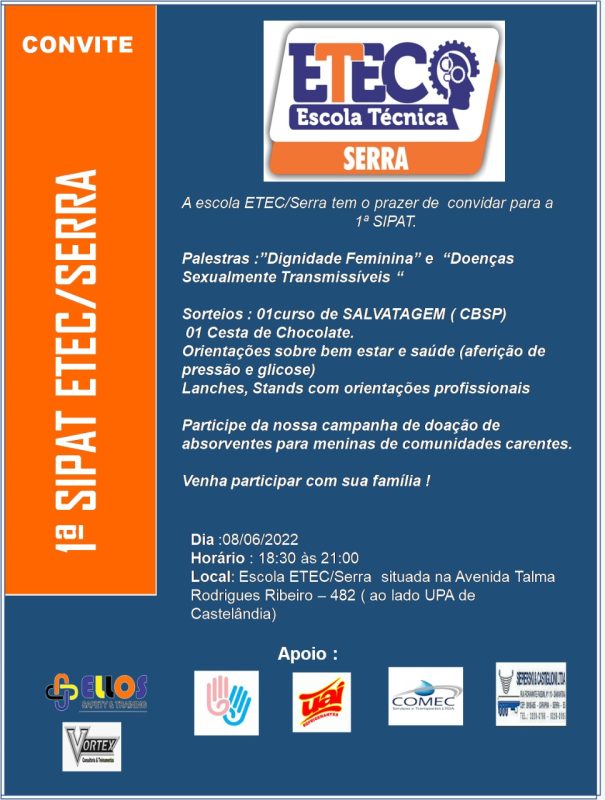 No dia 8 de junho, das 18h30 as 21h, irá acontecer a primeira SIPAT (Semana Interna de prevenção de Acidentes de Trabalho) da escola ETEC/Serra. Organizado pela turma de segurança do trabalho, o objetivo do evento é de integrar e conscientizar a população sobre os temas apresentados durante o encontro.