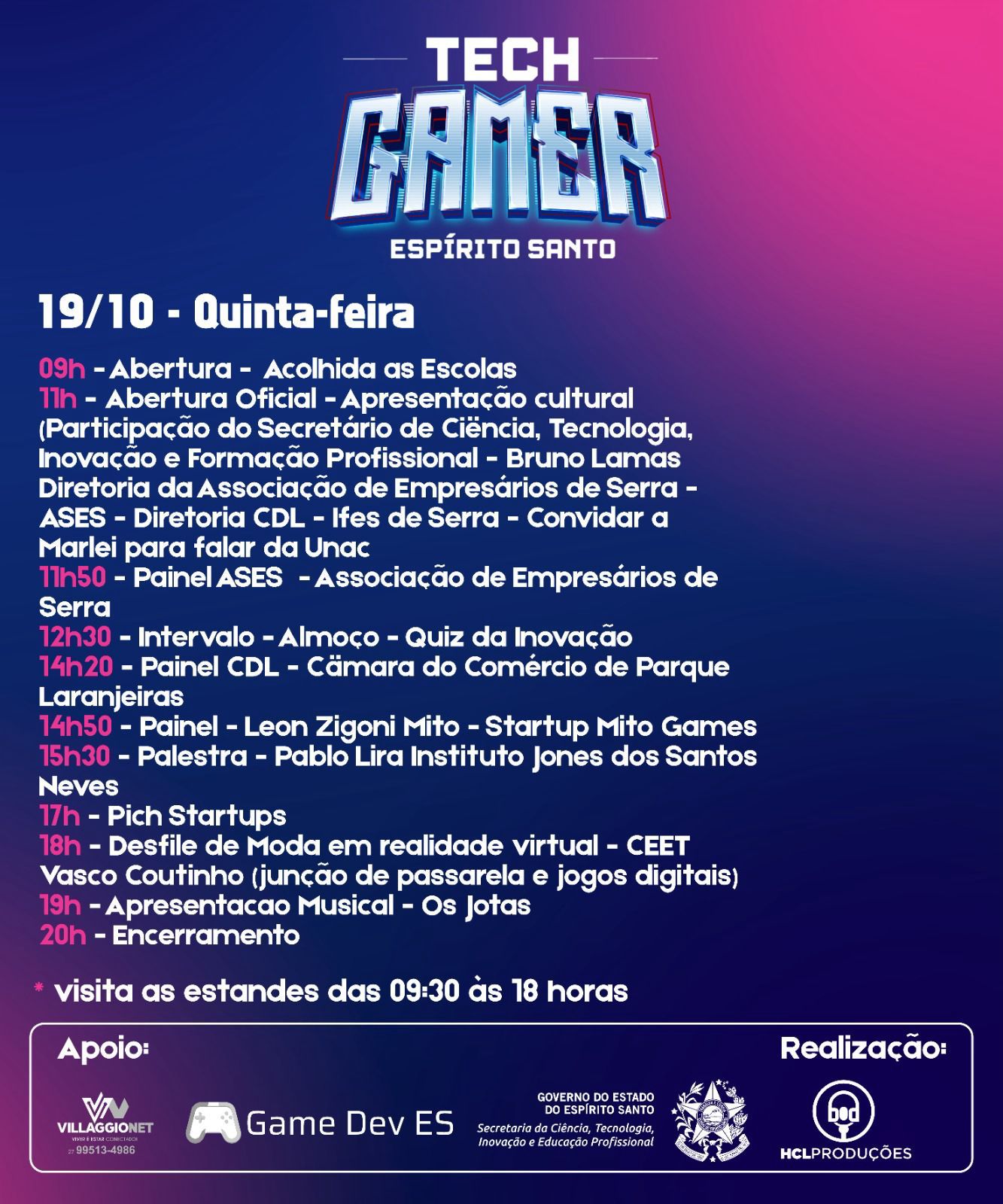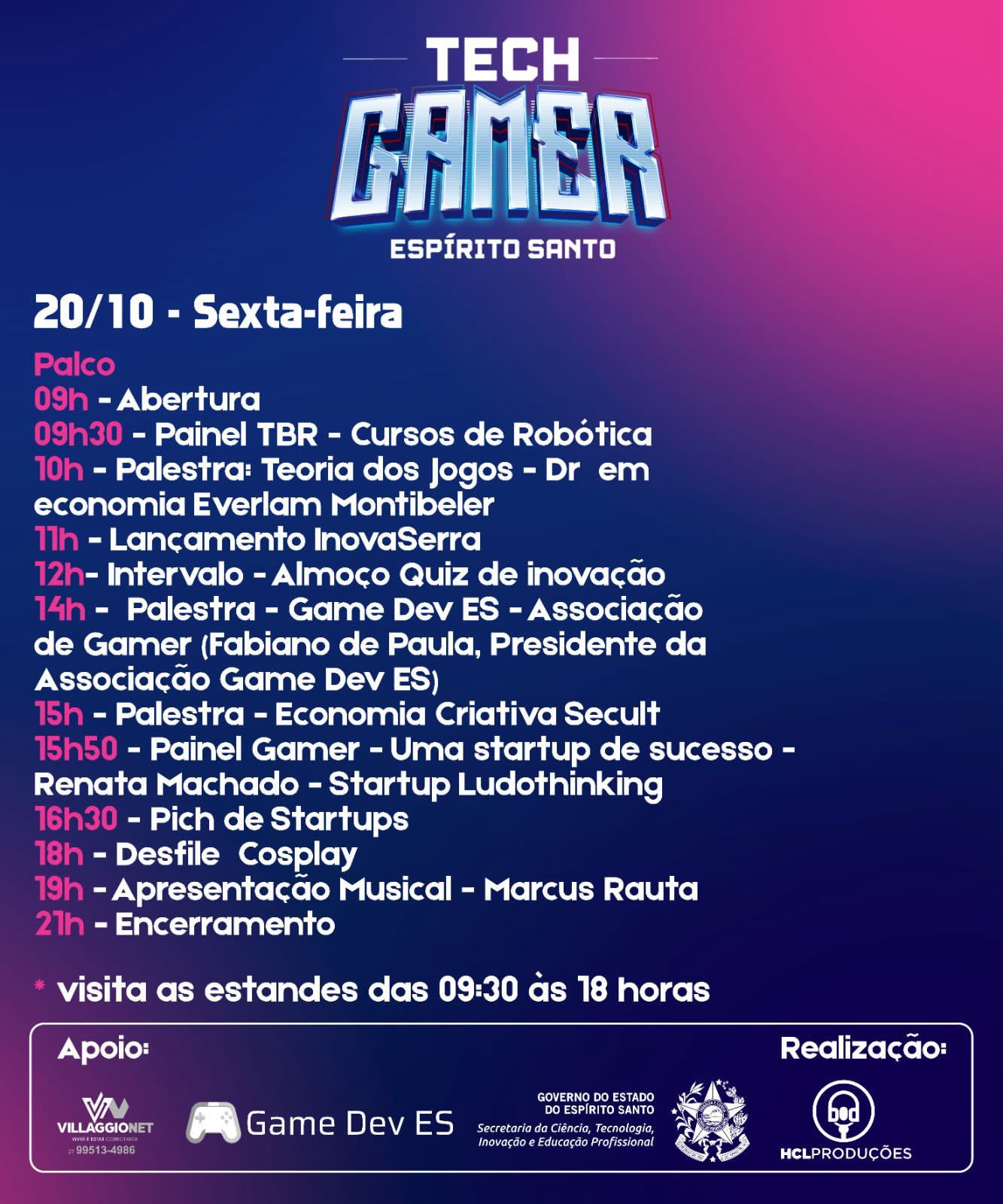 Pitch de startup, concurso de cosplay, palestras, apresentações de startups e atrações culturais vão marcar a Tech Gamer Espírito Santo, que acontece desta quinta (19) até o sábado (21), no Ginásio Laranjeiras, na Serra.