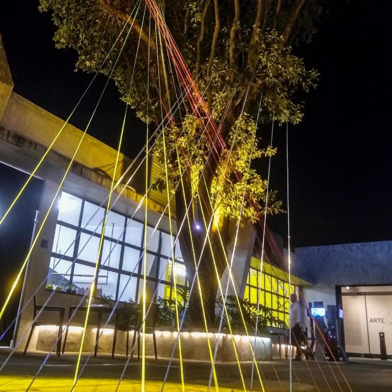 A instalação é inspirada num dos jogos mais antigos da humanidade: a cama de gato. Com um barbante, o visitante pode brincar e criar sequências geométricas de uma mão à outra. O resultado são posições e formatos curiosos que encantam e soltam a imaginação..