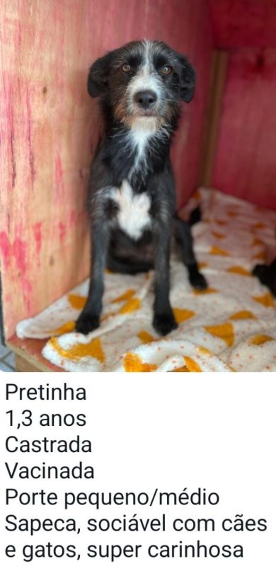 Dezessete animais entre filhotes e adultos estarão no local. Uma delas é a cadela Pretinha que foi resgatada em Cariacica, ainda filhote. Atualmente ela tem um ano e três meses, já é castrada e vacinada. Temo temperamento sapeca, sociável com outros cães e gatos e super carinhosa.
