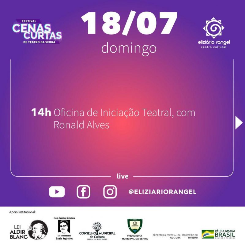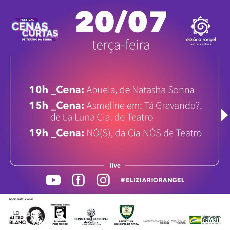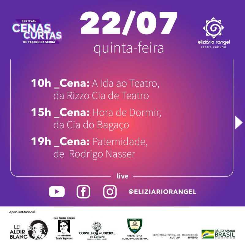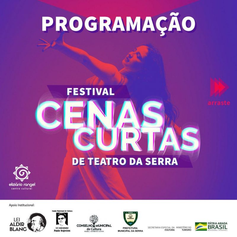 O Festival de Cenas Curtas de Teatro da Serra conta com o apoio da Lei Aldir Blanc por meio de edital da Prefeitura Municipal de Serra. Mais informações: Antonio Vitor (27) 99830-8813.