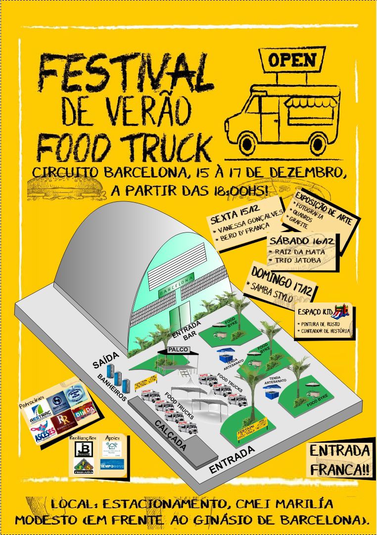Na onda dos food trucks, entre os dias 15 e 17 deste mês, em Barcelona, acontece o Festival de Verão Food Truck que promete levar para o bairro além de muita comida gostosa, exposição de arte, shows e espaço para a criançada. A entrada é gratuita. O evento sempre terá início às 18h. O festival acontece no estacionamento, em frente ao Ginásio de Barcelona.