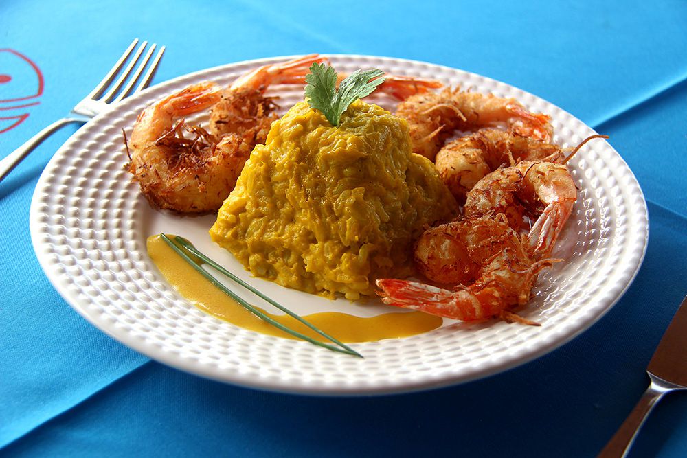 Enseada Tropical – R$58,00 por pessoa (Camarão médio empanado com lascas de coco acompanhado de arroz com creme de abóbora e molho de mostarda e mel)