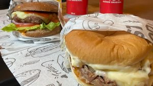 - Gorila’s Burger – Combo Doce Bruto – 2 burguers. Romeu e Julieta: blend 160g, queijo mussarela, goiaba, alface tomate, cebola roxa, molho estilo bigmac. Costelão: Costela desfiada, bacon, cebola roxa, mussarela, catupiry, banana frita, molho estilo bigmac. R$69,90 . 1 porção de batata frita e 2 refrigerantes em lata (serve 2)