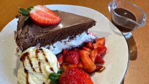 - Dilina Stein Confeitaria – Tentação de ninho & morango: Uma fatia de bolo com massa úmida de chocolate, recheada com mousse de leite Ninho e morangos frescos. Servida com uma generosa porção de morangos picados, sorvete cremoso e finalizada com calda quente de chocolate. Uma explosão de sabor que derrete no paladar. R$29,90 (serve 2 pessoas)