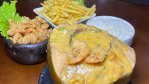 - Rei do Marisco Restaurante – Camarão cremoso: Delicioso prato de purê de batatas, recheado com camarão ao molho branco com catupiry, com uma camada de queijo gratinado por cima e finalizado com camarões fritos. R$89,90 (serve 2 pessoas)