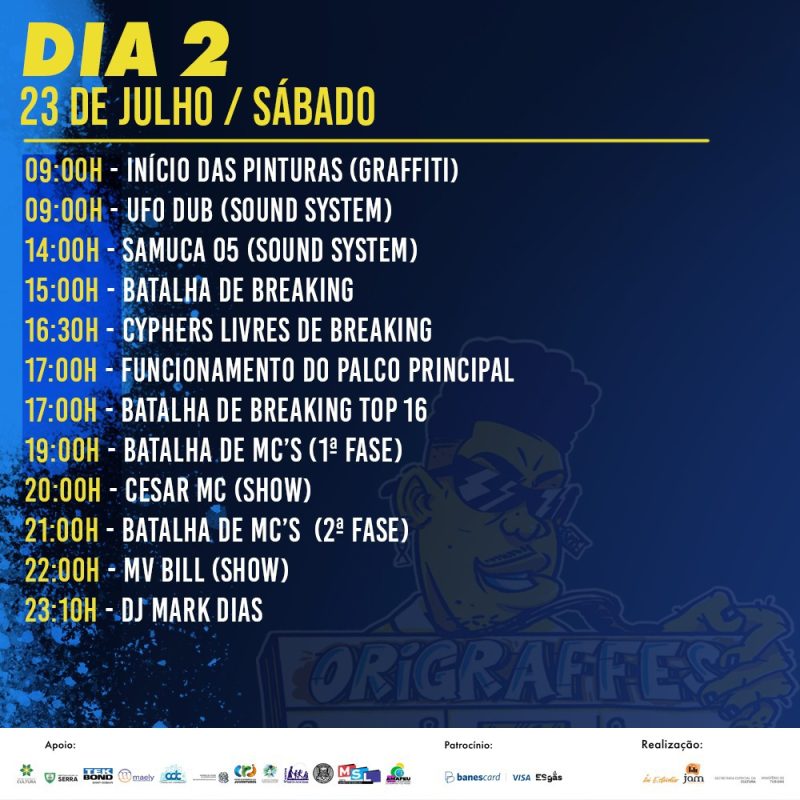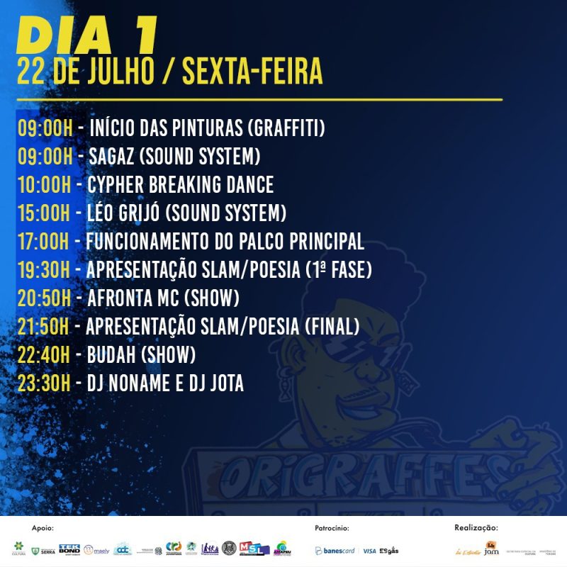O Origraffes também terá shows de César MC, Afronta MC, Budah, além de batalha de break, um painel coletivo com artistas convidados, slam, dj´s, workshop de graffiti, sticker e exposição de sticker (versões digitais dos famosos adesivos da década de 90). Além disso, também haverá lançamento de livros.