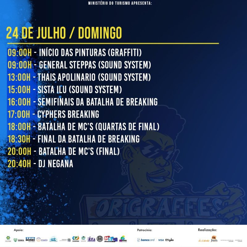 O Origraffes é realizado pelo Ministério do Turismo, Instituto Cultural da Vale e Banestes e conta com o apoio da Prefeitura da Serra por meio da Secretaria Municipal de Turismo, Cultura, Esporte e Lazer (Setur).