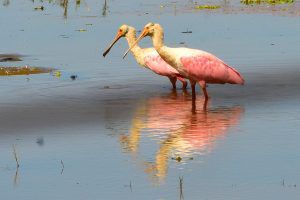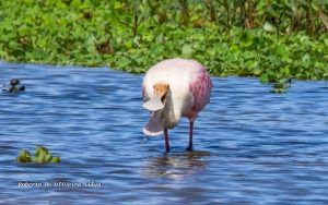 Outro fotógrafo que também estava no local, Roberto de Oliveira Silva da Amoaves (Associação Martinense de Observadores de Aves) destaca que o bico tem a forma de uma colher, por isso o seu nome colhereiro. “Ele usa o bico para peneirar a água à procura de peixes, camarões, moluscos e crustáceos que contém a substância carotenóide, que deixa as penas rosas”.