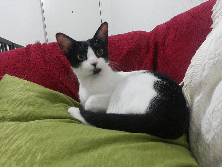 Essa gatinha preta e branca está disponível para adoção.