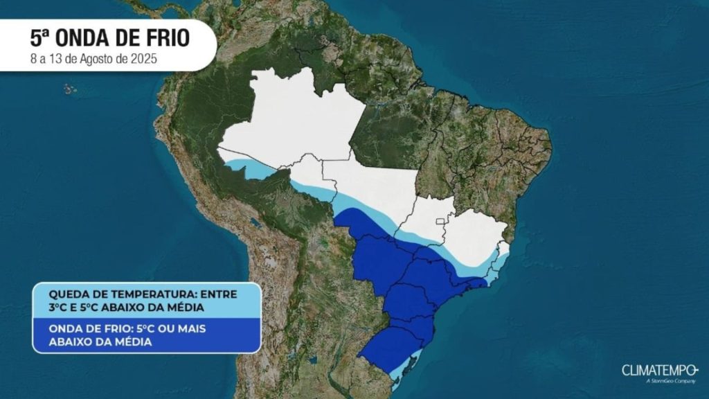 Nos próximos dias, a massa polar se espalha pelo Sudeste e Centro-Oeste, provocando também friagem no Acre e em Rondônia. Em algumas localidades, os termômetros podem marcar mais de 5°C abaixo do registrado nos últimos dias. Essa será a quinta onda de frio do ano e deve se estender até a próxima quarta-feira (13), com possibilidade de geada no Sul e no Mato Grosso do Sul.