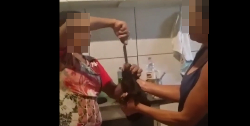 Um vídeo que circula nas redes sociais causou revolta nos internautas. Trata-se de uma senhora de 66 anos, que aparece dando um pedaço de carne supostamente com pimenta obrigando o animal a comer o alimento com a ponta de uma faca. Mesmo com os gritos do animal, tanto a idosa, quanto a pessoa que segura o animal e a neta que filmou toda a ação, nada fazem para evitar a maldade com o felino.