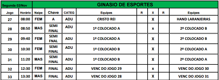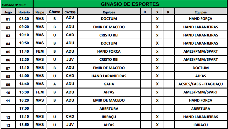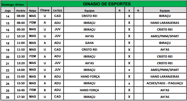 No juvenil masculino, com grupo único, os times AH’AS, Ibiraçu, Cristo Rei, AMES/PMM/SPART e cadete masculino também com grupo único com os times do Ibiraçu, Cristo Rei, Hand Laranjeiras, AH’AS. Os jogos começam a partir das 08h30.