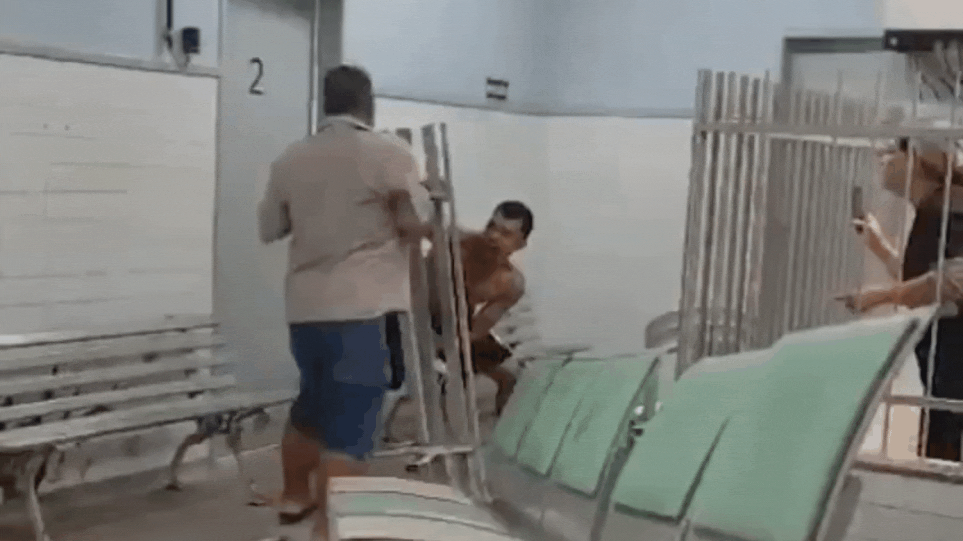 Os registros mostram o homem quebrando bancos, destruindo computadores e agredindo pessoas. Um outro homem presente na unidade tentou conter o suspeito utilizando um banco, mas acabou sendo jogado ao chão pelo agressor.