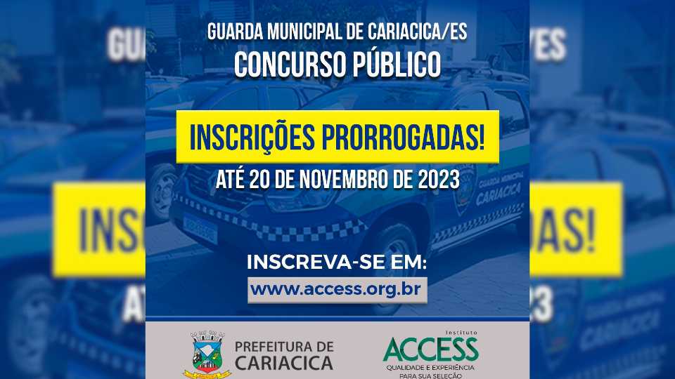 O prazo de inscrição do concurso para agentes da Guarda Municipal de Cariacica foi prorrogado. A seleção está sendo realizada através do Instituto de Acesso à Educação, Capacitação Profissional e Desenvolvimento Humano (ACCESS) e oferta 35 vagas para início imediato, além de formação de cadastro de reserva.