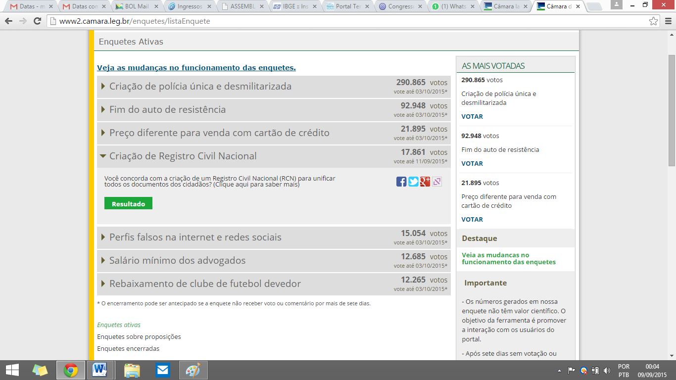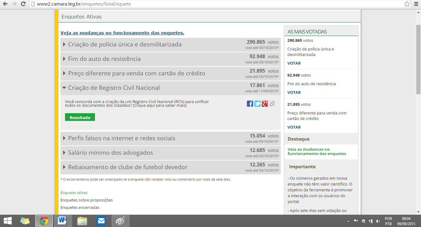 Existem ainda outras seis enquetes ativas. São elas: criação de polícia única e desmilitarizada; fim do auto de resistência; preço diferente para venda com cartão de crédito; perfis falsos na internet e redes sociais; salário mínimo dos advogados e rebaixamento de clube de futebol devedor.