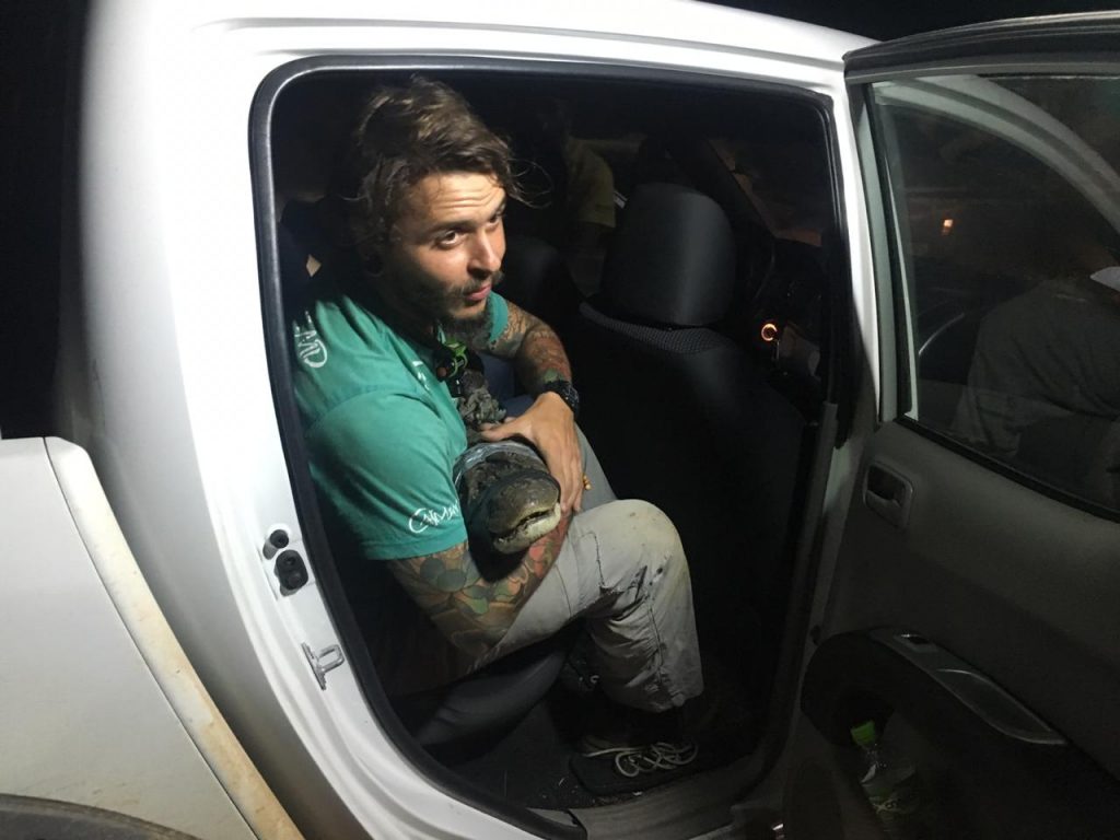 José Neto Barcelos, que mora no sítio onde o jacaré foi encontrado disse que foi um baita susto. “Graças ao empenho da minha esposa Lívia Guimarães e ao meu grande amigo Marcelo Marcelo Guadagnin Warung Cerimonial em busca de órgãos competentes na captura desse animal, o resgate foi efetuado com grande sucesso. O animal se encontrava na porteira do meu vizinho Adélio colado em minha casa, e quando o motoqueiro veio trazer um lanche para minha esposa gritou e se assustou com jacaré ao lado dele. De imediato entrei em contato com a minha esposa pedindo para que a mesma buscasse ajuda através das redes sociais. Então ela entrou em contato com a policial militar Brisa que de imediato nos forneceu o telefone do projeto Caiman. De posse desse número fiz o primeiro contato com Yhuri em seguida passando o contato para o meu vizinho Marcelo que de imediato também entrou em contato com pessoal do projeto Caiman. Contato feito aguardamos a chegada do pessoal do projeto que foi super atencioso com a gente e o resgatou com louvor. Graças ao nosso bom Deus nenhum animal foi atacado ou pessoas. O animal foi encaminhado para a universidade UVV onde recebeu os primeiros cuidados e de lá será encaminhado para um ambiente onde será cuidado por alguns dias e depois solto na natureza”, afirma Neto que disse a aparição ocorreu por volta das 21h30.