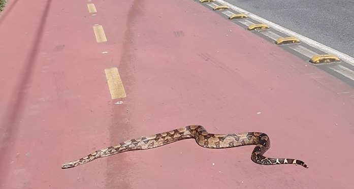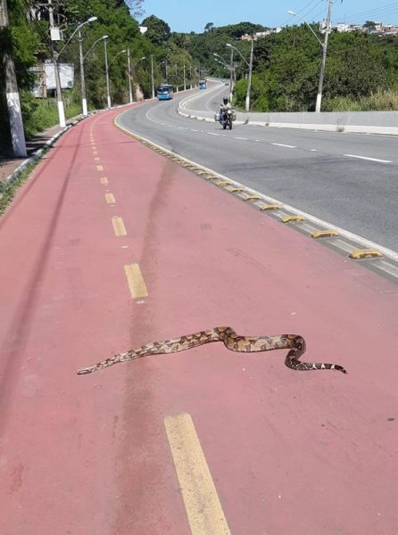 Jefferson Batista fez o flagrante da cobra no último domingo (16) a tarde e conta que a viu quando passava pelo local de moto. “Eu fiz o vídeo no último domingo (16) enquanto passava na região de moto e quando subi o tobogã eu avistei a cobra atravessando a ciclovia”, conta.