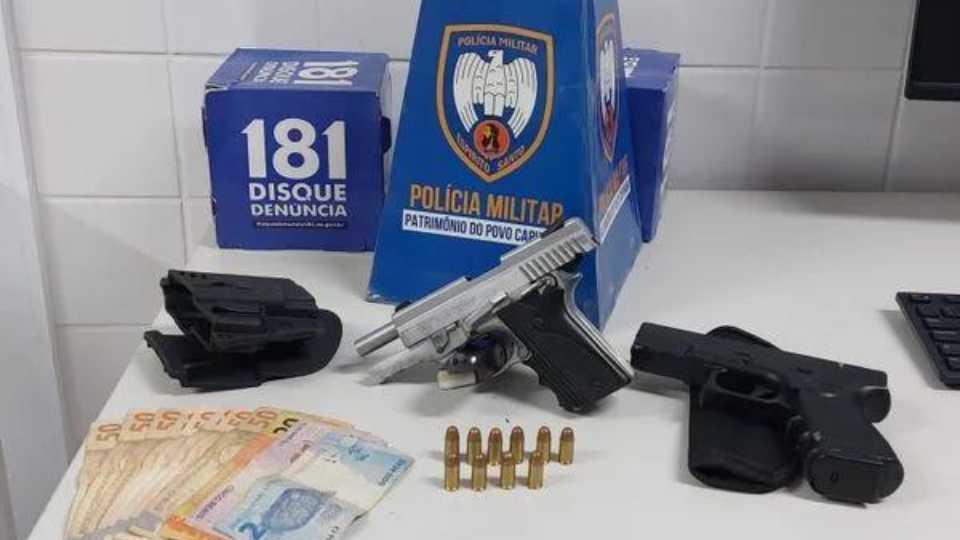 Os policiais fizeram buscas dentro do estabelecimento e encontraram uma pistola, uma arma falsa, munições e R$ 427 em dinheiro.