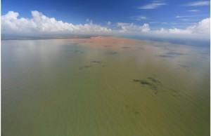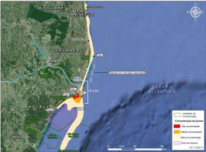 A parte de alta e média densidade da lama está concentrada na foz do rio Doce, em Regência, litoral de Linhares.