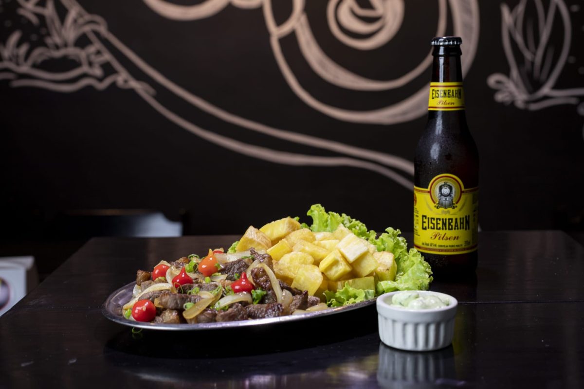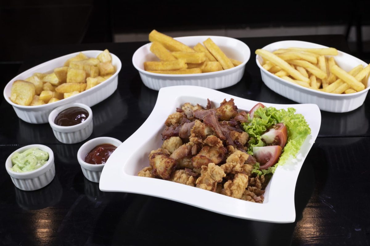 Entre as porções estão bolinho de bacalhau, franguinho, bolinho de queijo com molho de goiabada e a carne de sol na manteiga de garrafa com aipim.
