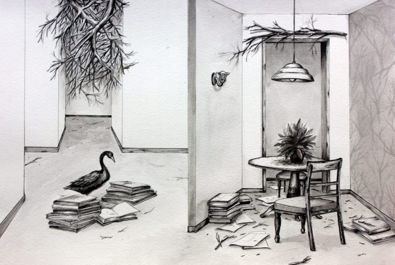 A artista trabalha com o simbólico. O tema recorrente é o ambiente doméstico e sua solidão. A casa é a personagem principal, lugar de início e fim da vida. Nenhum elemento que compõe seus trabalhos é aleatório: um galho seco no chão, um papel amassado no canto da sala, um livro esquecido, um sofá. Nada está no papel por acaso.